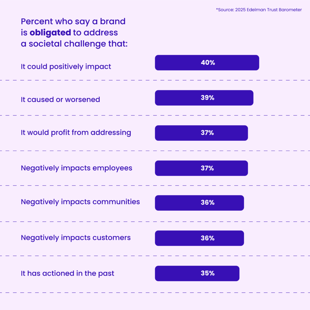 Among those who said a brand is obligated to address one or more societal issues, 51% say they are less likely to buy from it and lose trust in it if the brand ignores that obligation.